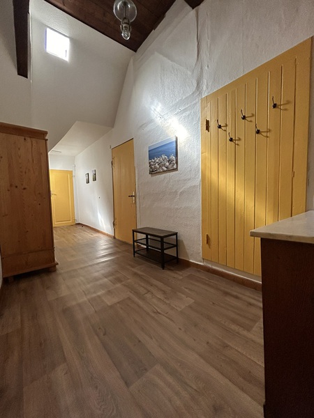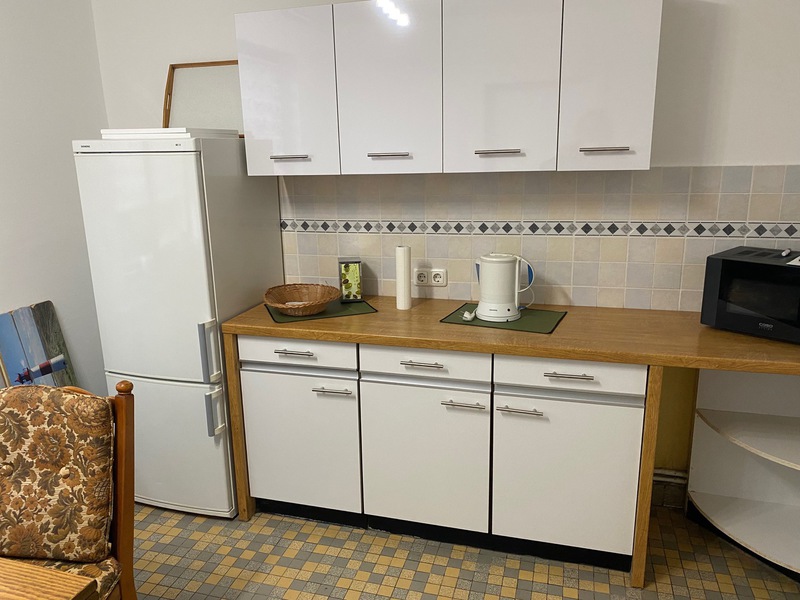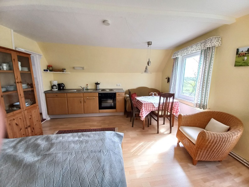 Die im Obergeschoss liegende Monteurwohnung ist 50 m² groß. Sie verfügt über ein Zimmer mit Küchenzeile (inkl. Geschirrspüler), Ess-, und Wohnbereich und ein Schlafzimmer mit einem Einzelbett und einem Etagenbett sowie einem geräumigen Flur. Großzügig ausgestattete Küche mit Geschirrspüler, helles Duschbad, freies WLAN, Gemeinschafts-Waschmaschine und -Trockner, PKW-Stellplätze.