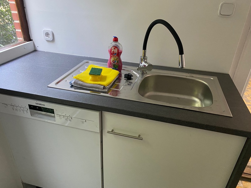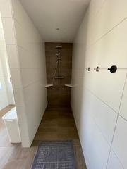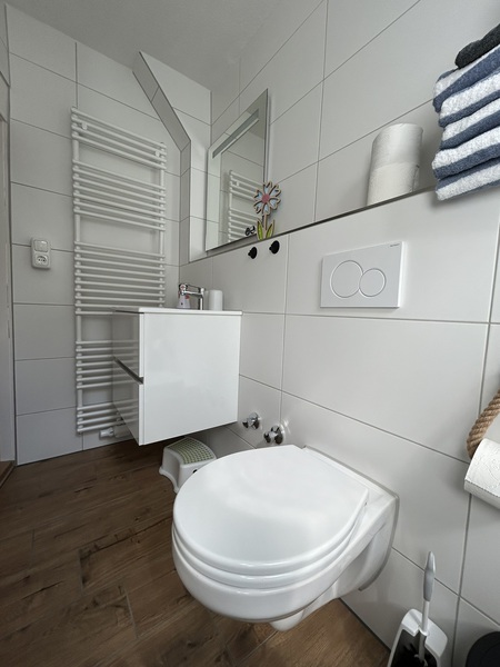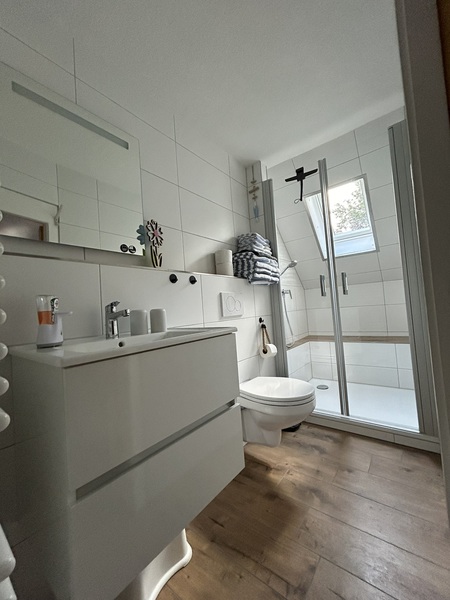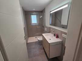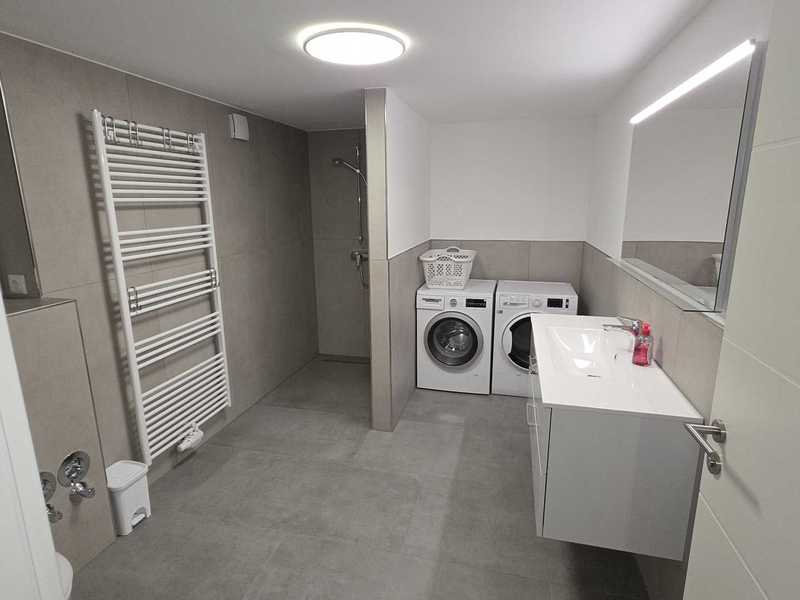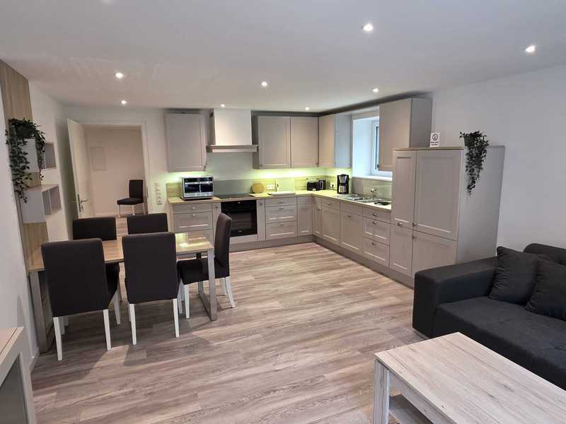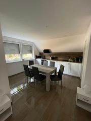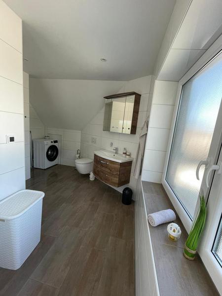 Monteurwohnung für 7 Personen: 3 Schlafzimmer(3+2+2), moderne Wohnküche (Kühl-Gefrierkombi, 4-Plattenherd mit Backofen, Geschirrspüler, Mikrowelle) mit Couch und TV, 2 helle Duschbäder, Terrasse mit Sitzgelegenheit, freies WLAN, Waschmaschine und Trockner.