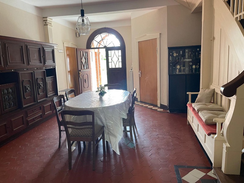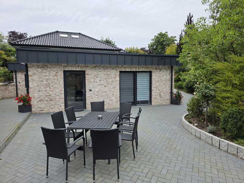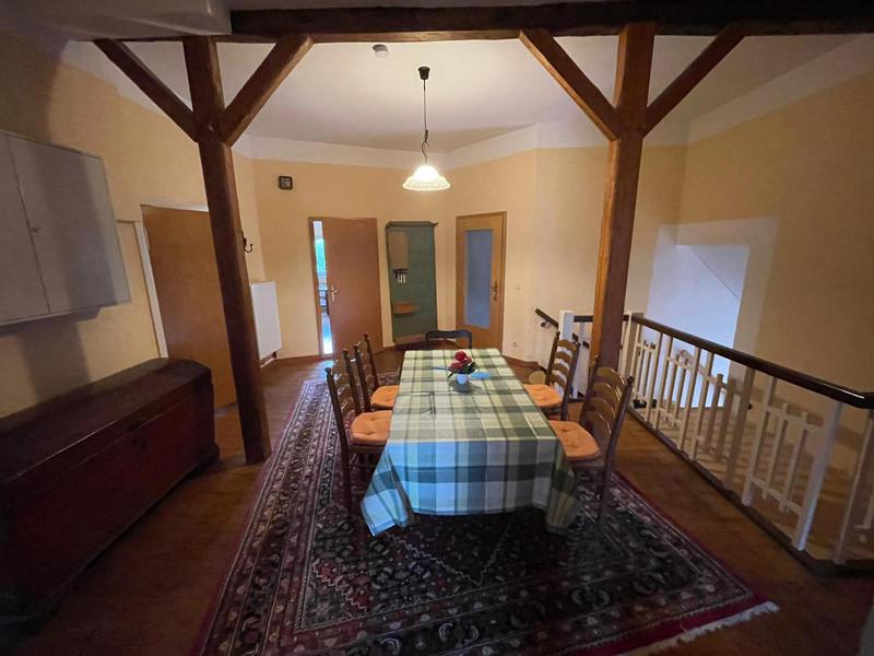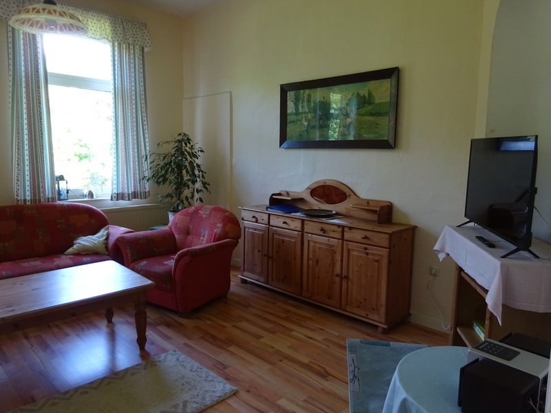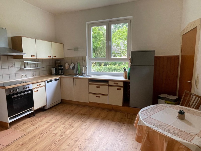 Monteurwohnung für 4 bis 6 Personen: Wohnzimmer mit 3er- und 2er Sitzgarnitur, Einzelbett und Flachbild-TV, ein Schlafzimmer mit zwei Einzelbetten, ein weiteres Schlafzimmer mit drei Einzelbetten, großes Wannenbad. Separate große Wohnküche (4-Plattenherd mit Backofen, Kühl-Gefrierkombination, Geschirrspülmaschine, Mikrowelle). WLAN, PKW-Stellplätze vor und hinter dem Haus, Garten mit Grillplatz, Gemeinschaftswaschmaschine.