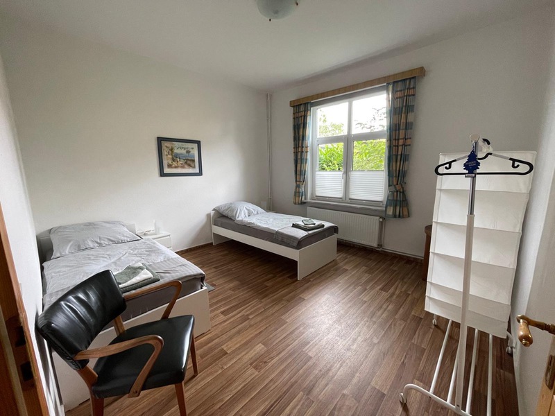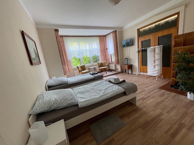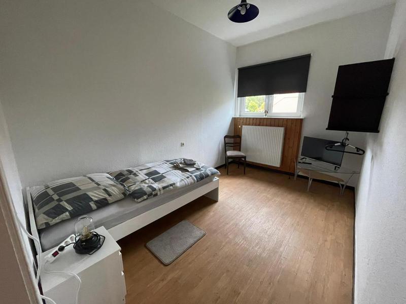 Monteurwohnung für 5 Personen: 3 Schlafzimmer mit jeweils einem Flachbild-TV: 2 Schlafzimmer mit zwei Einzelbetten, 1 großes Einzelzimmer mit Tisch und Couchgarnitur. 1 Erker mit Sitzgelegenheiten, helles Duschbad und kleine Küche. Kostenfreies WLAN, PKW-Stellplätze vor und hinter dem Haus, Garten mit Grillplatz, Gemeinschaftswaschmaschine.