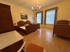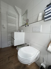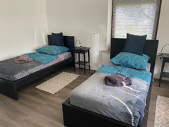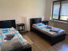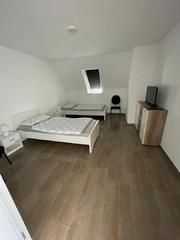 Große Monteurwohnung für 4-5 Personen mit zwei Duschbädern und vier Schlafzimmern, Wohnzimmer mit TV, separate Küche. Die Schlafzimmer sind jeweils mit einem Doppelbett (kann auch als Einzelzimmer belegt werden) ausgestattet. In einem der Schlafzimmer befindet sich neben dem Doppelbett ein weiteres Einzelbett sowie eine Sitzecke mit TV.