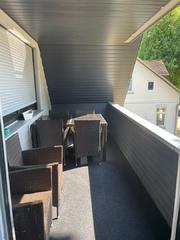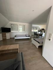 Monteurwohnung für 5-6 Personen: 1 Schlafzimmer mit 2 Einzelbetten mit TV, 1 Einzelzimmer mit TV, großes Wohn-Schlafzimmer mit 2 Einzelbetten und Schlafcouch mit TV und offener Wohnküche, helles Duschbad, Terrasse und Balkon jeweils mit Sitzgelegenheit, freies WLAN, Waschmaschine und Trockner.