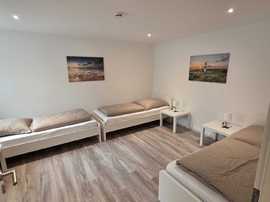 Monteurwohnung für 3-6 Personen: Ein Schlafzimmer mit 3 Einzelbetten, ein Wohn-Schlafzimmer mit 3 Einzelbetten, Fernseher, Wohnküche und Duschbad. Kostenfreies WLAN.