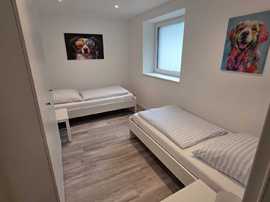 Monteurwohnung für 3-5 Personen: 2 Schlafzimmer mit je 2 Einzelbetten, 1 Einzelzimmer, jedes Schlafzimmer mit Flachbild-TV, freies WLAN, Küche, helles Duschbad, Waschmaschine.